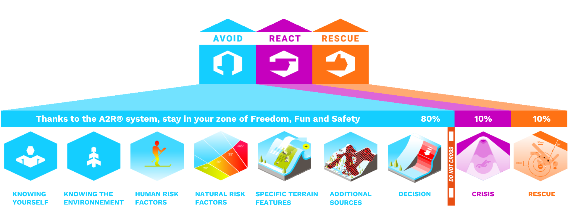 Ride in your zone of pleasure, freedom, and safety! Learn to better understand yourself and your environment, as well as the human and environmental risk factors. Discover specific terrains, additional sources of information, and learn how to adapt your decisions. That’s 80% of the course.